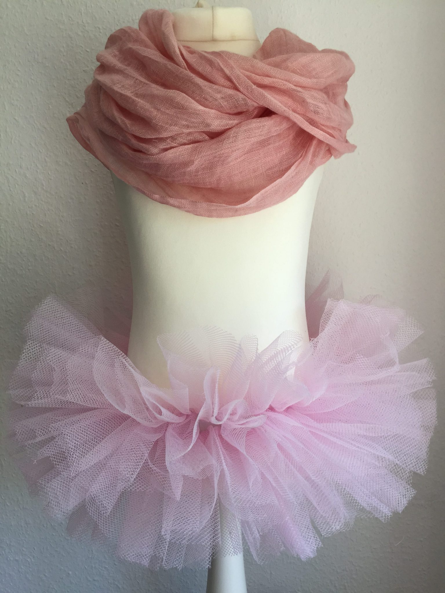 Die Länge einer Bahn entspricht etwa 3 – 4 x dem Taillenumfang, z.B. Taillenumfang ca. 50 cm – Länge der Tüllbahn mindestens 150 cm – 200 cm – nimm lieber mehr, denn übersteh2ender Tüll wird später weggeschnitten.